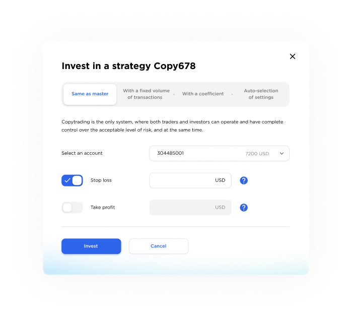 Nakakolekta kami ng mga natatanging posibilidad para sa pag-customize ng pagkopya ng pag-trade. Hanapin ang perpektong kombinasyon na mga settings upang umangkop sa iyong estilo ng pag-trade.