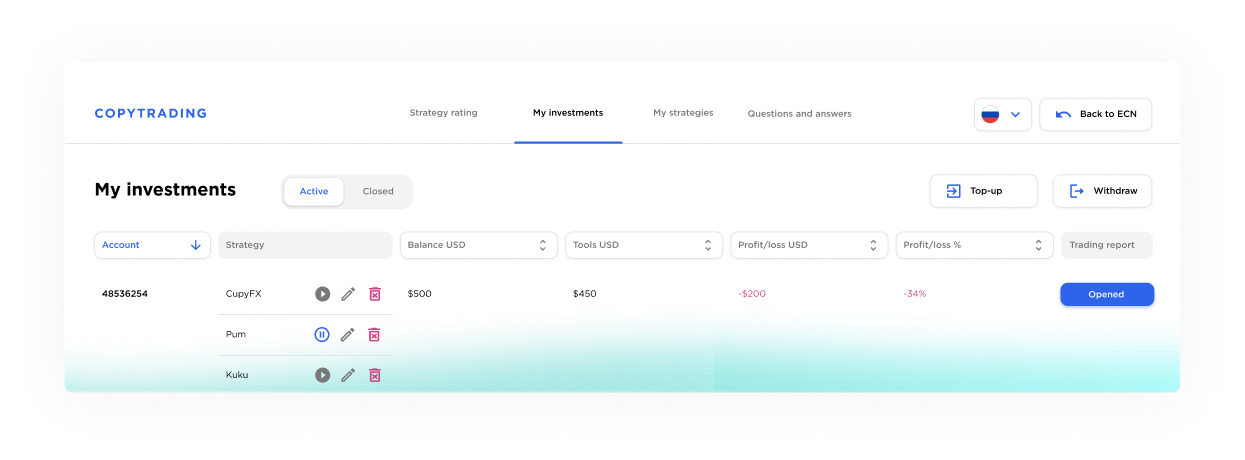 Sa OnFin CopyTrading maaari mong parehong pamahalaan ang mga istratehiya at mag-subscribe sa mga ito sa parehong oras. Para sa layuning ito kailangan mong magbukas ng iba't ibang mga account.