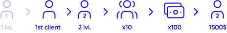 Ang Kasosyo 1 (Antas 1) ay nagrehistro at nagsimulang mag-refer ng mga kliyente. Nag-sign up sila ng 10 kostumer. Ang mga kliyenteng ito ay magkasamang naglagay ng 100 lote. Alinsunod sa mga tuntunin ng programa ng gantimpala ng kasosyo, makakatanggap ang Kasosyo 1 ng 15$ bawat lote. Kaya kikita sila ng 100x15$ = 1,500$.