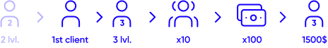 Ang kanilang unang kliyente ay naging kasosyo (Antas 2) at nagre-refer ng 10 pang kostumer. Ang mga kliyenteng ito ay magkasamang naglagay ng 100 lote. Alinsunod sa mga tuntunin ng programa ng gantimpala ng kasosyo Antas 2 na