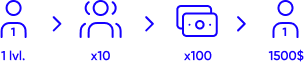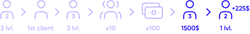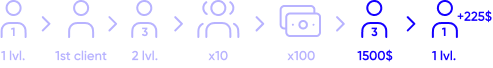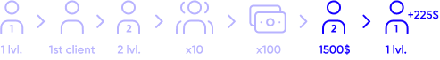 Kaya, ang Antas 2 na Kasosyo ay kikita ng 1,500$ para sa mga nai-refer na kliyente + 225$ para sa Antas 3 na Kasosyo = 1,725$ sa kabuuan.